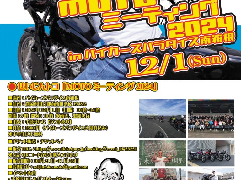 みなさん!こんばんわ! SANCTUARY WiLL 仁科です。 12月1日にバイカーズパラダイス南箱根で行われる ・せいじんトコ「MOTOミーティング2024」 にブース出展致します。 当日は、車両展示や…